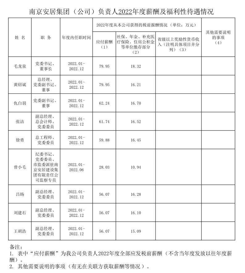安居集团负责人2022年度薪酬及福利性待遇情况