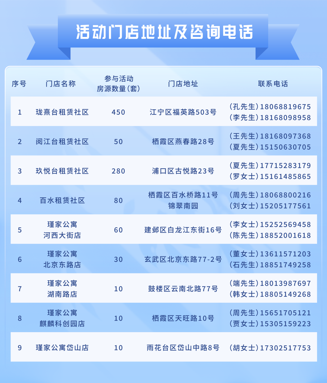 安居瑾家公司旗下9家门店,共计约1000套房源,以门店实际可出租房源为准,先到先得,额满即止。